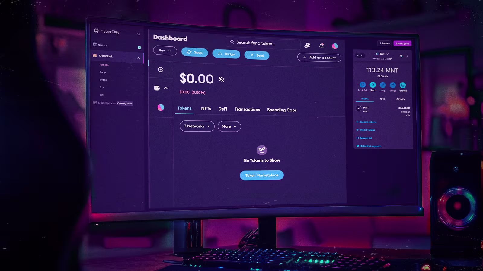 HyperPlay’s game store brings token swaps, cross-chain bridging, and easy cash to crypto on-ramping into every game through our in-game overlay. This overlay is powered by MetaMask Web, making it secure and easy for gamers to access all of these functions no matter what game they're playing. Wallet transactions take place without leaving a game — reducing friction, improving safety, and preserving immersive experiences.