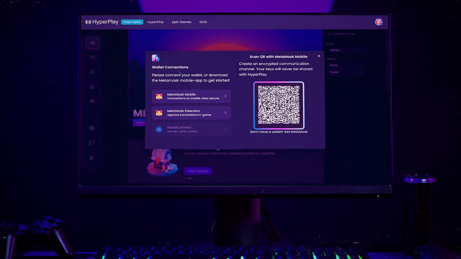 HyperPlay’s MetaMask integration also results in another essential benefit: a safer onboarding experience. The HyperPlay app allows for MetaMask transactions to be visible on-screen without the need to leave or even minimize the gaming experience, all while preserving the privacy of user keys. Secret recovery phrases are never exposed to games, and can even be kept off the gaming computer itself.
