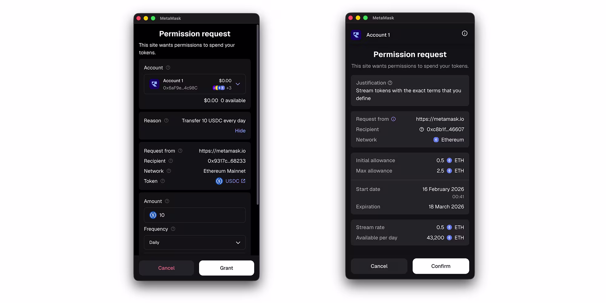 Our newly launched Advanced Permissions—built on ERC-7715 and part of MetaMask Smart Accounts Kit—lets users approve exactly what a dapp can do in a single interaction. Your dapp executes within that scope through a session account. The user's wallet stays in their control.