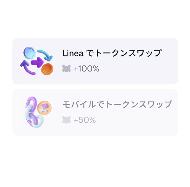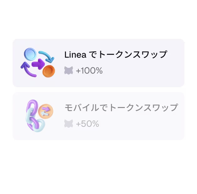 取引アクティビティでポイントを獲得してレベルアップ!レベルが上がるたびに限定特典がアンロックされます。レベル2到達後は、累計ポイントに応じて $LINEA が付与されます。