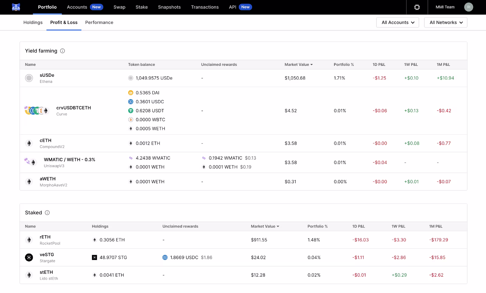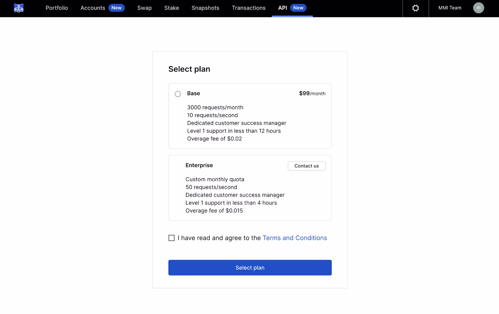On the API page, we provide users with detailed information about our API offering. Proceeding to the next step, users can choose between two tiers: the base tier and the enterprise tier. If an organization requires higher quota limits, more favorable rate limits, or lower overage fees than those provided in the base tier, please contact us, and we will work with you to create a customized enterprise package that meets your specific needs.After selecting a tier and agreeing to the terms and conditions, users will be taken to the next screen, where they can easily access their API keys and view their current monthly usage. To access our comprehensive API documentation, simply click on the button located in the top right corner of the screen.Our API documentation provides a detailed description of each endpoint. On the left side of the documentation, we have organized the endpoints into four main categories: Account, DeFi, Snapshots, and Transactions. Before users can start utilizing the endpoints, they must first add their accounts to their organization by using the 'save several addresses' endpoint within the Accounts section.After successfully adding the desired accounts, users can then request snapshots, transaction history, or DeFi data for those specific accounts. This allows for a more targeted and efficient approach to retrieving the necessary information for portfolio management and analysis.Start leveraging the power of MMI's APIs today and take your web3 portfolio management to the next level. For more information, check out our API FAQs or contact your sales representative or our customer support team.Q1: What functionalities do your APIs offer? A1: Our APIs provide a comprehensive suite of endpoints that support operations such as taking snapshots, generating transaction histories, and retrieving profit and loss (P&L) along with performance data for accounts on Ethereum and Solana. We prioritize high reliability and performance, delivering minimal latency and maintaining a robust uptime of 99.99% to ensure uninterrupted service.Q2: What is the pricing for your API services? A2: Our base tier is available at a cost of $99 and can be added to your existing MMI subscription. For standalone use of our APIs with enhanced quota limits, please contact us for more details.Q3: Is it possible to exceed my quota limit on API requests? A3: Yes, you can exceed the defined quota. We apply an overage fee for any requests that surpass your quota limit. Please contact us for more details.Q4: How and when am I billed for the API usage? A4: Billing occurs at the end of each month. We will send you an invoice that includes the total number of API requests made during the month and charges for any additional MMI services utilized.Q5: Which blockchains are supported? A5: Our snapshots endpoint currently supports all EVM-compatible chains and Solana. For other endpoints, such as transaction history and DeFi positions, we currently offer support for EVM-compatible chains only. We plan to add support for additional chains in the future.Q6: How do you calculate the P&L of a position? A6: Our DeFi position and profit endpoints are powered by our community-built DeFi adapters, which are part of our open-source DeFi adapter library. By using these adapters, we can fetch the underlying assets and respective balances that make up an LP position and compute the P&L for different time periods.