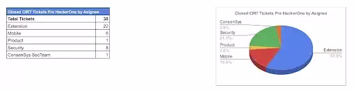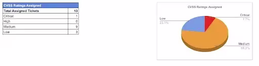 During the first half of 2022, we closed 38 tickets. Distributed by source, the majority of them are from Reporters, which are more than double the number of tickets from Audits and Internal sources combined.Regarding the Assignees of the tickets, we find the majority of the reports go to the Extension, followed by Security-focused issues (that is, not related to any of the major MetaMask products), and then Mobile. These 3 categories amount to more than 90% of the reports. 2 issues were assigned to Product (UI) and the Consensys Security Team, respectively.Of these 38 tickets, only 13 were assigned with a CVSS Score. Most of these tickets got a Medium severity (9), with 1 Critical, and 3 Low severity reports.