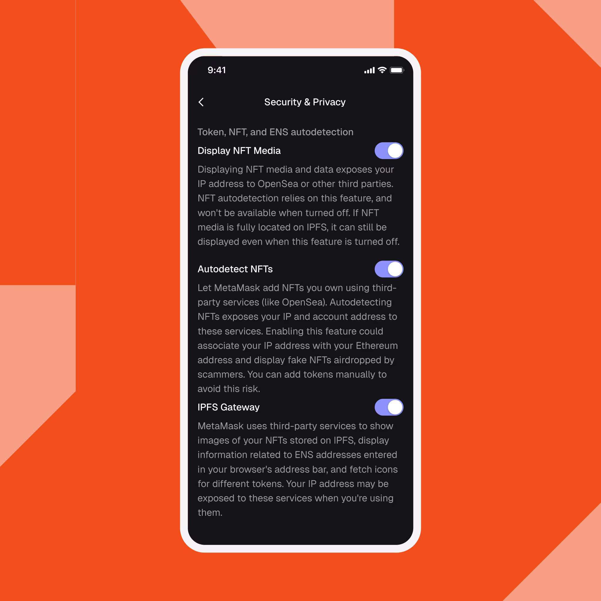 As a MetaMask user, you know how much privacy matters. MetaMask is deeply committed to user consent and choice when it comes to personal information. We’re constantly evolving the wallet to be equipped with the functionality and features that allow you the freedom to choose how your data is used, while preserving your privacy and security. Today, we’re excited to highlight the comprehensive set of MetaMask features that do precisely this.We empower users to interact across the internet with complete, granular control over their data and communication methods. When we introduce new features (e.g., a new data feed or transaction optimization), we always make these new features configurable, so that a user can toggle the feature off or on based on whether it satisfies their individual data or privacy preferences.Examples of these configurable settings and features include:Basic functionality: Our default experiences provide users with certain basic features like network fee estimations, details about tokens, and warnings about potentially malicious sites. We think these features are foundational elements for a great wallet experience, but we give users the ability to easily opt out of this basic wallet functionality with a single click.