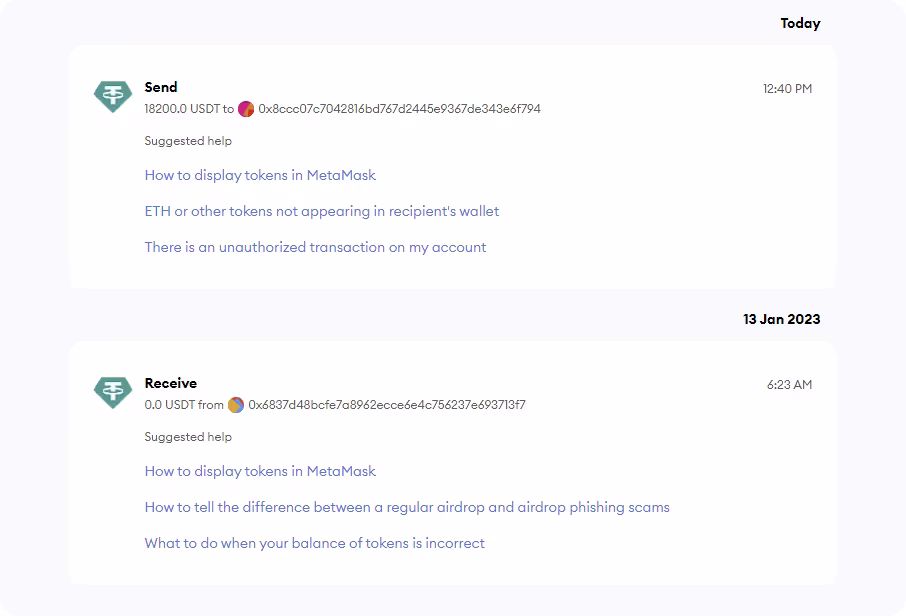This initial version of MetaMask Activity offers this functionality on Ethereum Mainnet, and it sets the stage for functionality that can be built on top of it: address-authenticated, transaction-specific Support chat; multi-chain analysis; the potential for more advanced features like dapp permissions management and assisted account migration tools.