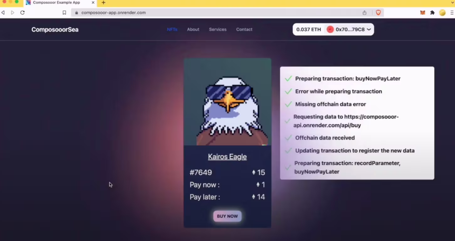 We made a fully integrated demo in the form of a react-wagmi dapp. This dapp makes it possible to buy an NFT paying only a small fraction of the price upfront and taking a loan to repay later to finance the rest. Onchain, it is no less than 8 contracts which are involved in the transaction. In the middle of it, the NFT marketplace requires an offchain signature of the NFT seller. The composooor snap is able to pick up the error, decode it and provide the information onchain (after being fetched in an api) despite the complexity of the transaction. Composooor made this app way simpler to implement.What are the next steps if you would implement this?