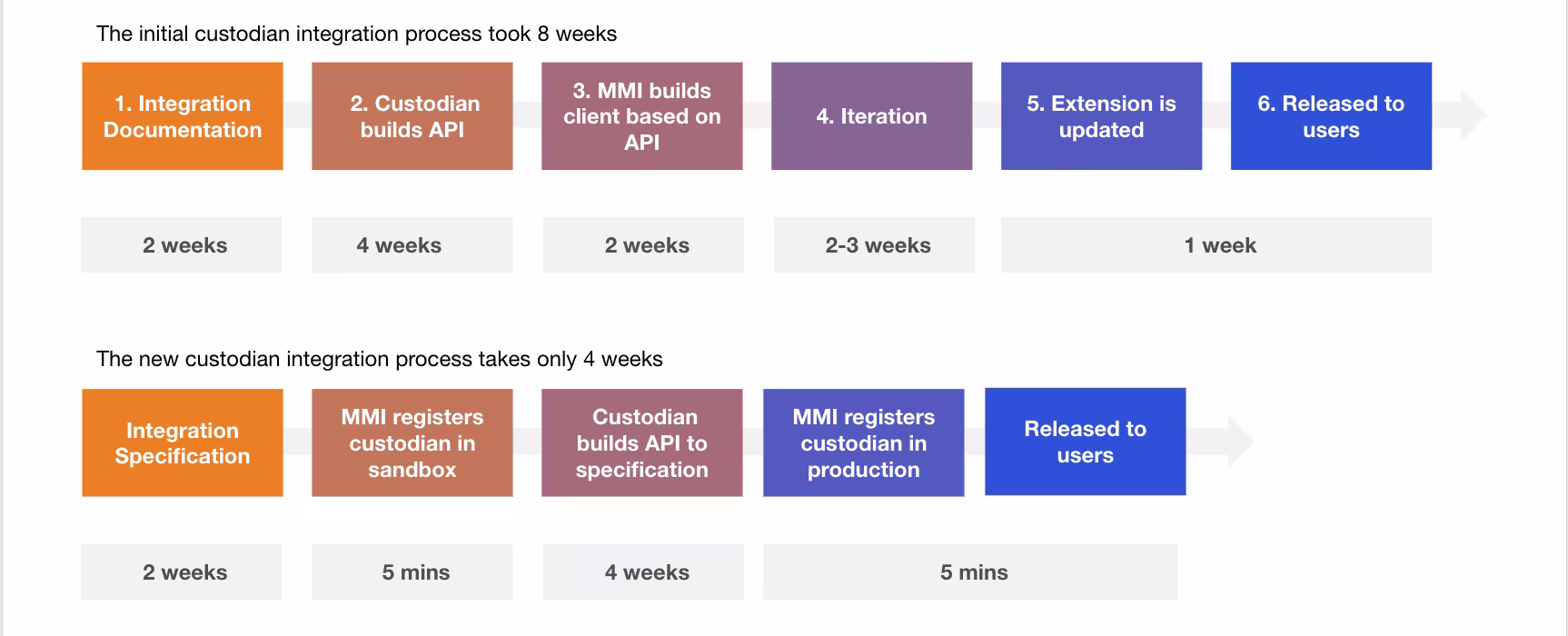 MMI—like the original non-custodial MetaMask wallet—offers its users access to DeFi and Web3 across all EMV-compatible chains. MMI differs from the original MetaMask in that it is a custodial wallet. This means that custodians and custody technology providers facilitate key storage, key management, transaction signatures, and transaction broadcasting for MMI users, in line with institutional regulations.Given that it is the custodians who broadcast the transactions—the actual EVM chain access of MMI users is determined by the chains supported by their custodian. In practice for example, if a custodian only supports transactions on the Ethereum mainnet and Polygon network, then an MMI user would be limited to transacting across these two chains. Accordingly, we rolled out our multi-chain feature that will support our custodian partners in rolling out more EVM chain access. This will give custodians the capabilities to add, sign, and broadcast any custom RPC URL specified by the user—making the rollout of new EVM chain support much easier.The ability to bridge assets is a fundamental institutional need within DeFi. This entails performing a cross-chain swap by depositing an asset into a bridge contract in one chain and then receiving minted assets on another chain. Bridging allows the ability to move assets to APY and unlocks yield farming opportunities across EVM chains.Based on the way many custodians are architected meant that MMI, historically, has connected one account to one network. This means that institutions would set up an account at a custodian and then have that account tied to a particular network, for example, Mainnet or Polygon. This one to one relationship, although providing access, prevents the bridging of assets. For assets to be bridged, the address used to deposit tokens into the bridge contract must be the same to receive the minted tokens.With our multichain feature, we removed the connection between accounts and networks historically held by custodial accounts. This means that similar to MetaMask, custodial accounts on MMI will be available across multiple networks. As our custodian partners roll out more EVM-chain support, users will automatically have access to accounts on these chains, with no additional work required from either party—allowing for the bridging of assets across chains.To address the different custody needs of all organisations seeking to enter the DeFi and Web3 space, MetaMask Institutional practises custodian-agnosticism. This means we work with multiple custodians that offer different custody technology stacks. It is our goal to ensure that the integration of any custodian is fast, seamless, and requires the lowest development effort possible.At the start of January, we launched our V2 JSON-RPC API Integration Architecture.This latest version allows us to compress integration steps and dramatically simplify the onboarding of new custodians by standardising our integration stack. We have also aligned the API custodians need to build with the JSON-RPC API, an open-source standard.While integration still requires minimal bespoke work from the MMI team, new custodians can now integrate with a standard API and client. This movement towards a “self-service” model has allowed for multiple custodians to integrate simultaneously during the last quarter.In addition, aligning our custodian API with an open-source JSON-RPC standard transforms our stack into a platform that developers can build and innovate on top of. It also aligns MMI’s architecture closely with that of MetaMask and Infura. With the JSON-RPC API, custodians could eventually write snaps for MMI and MetaMask while Infura developers can build and launch custodians and custodian services.